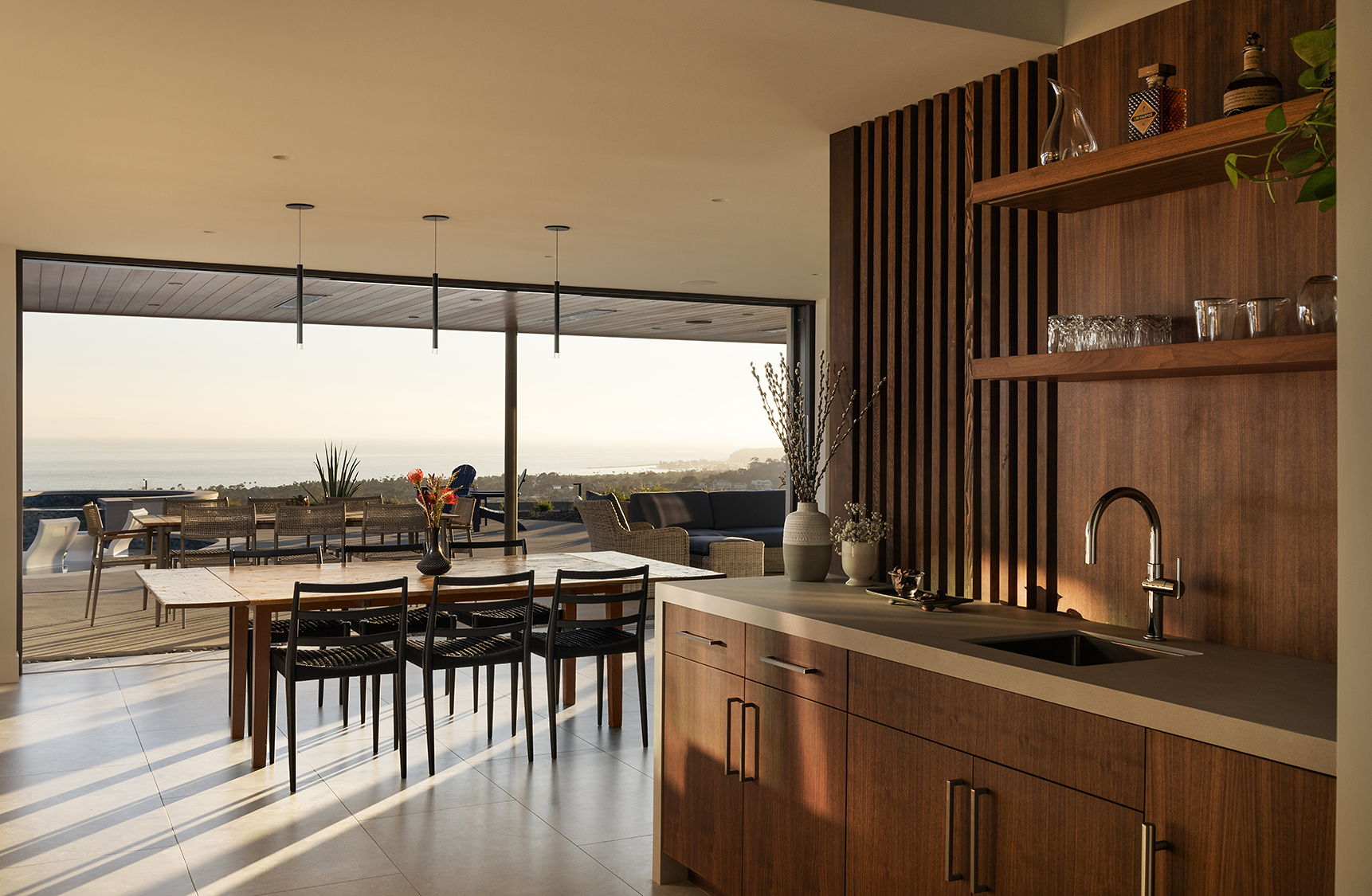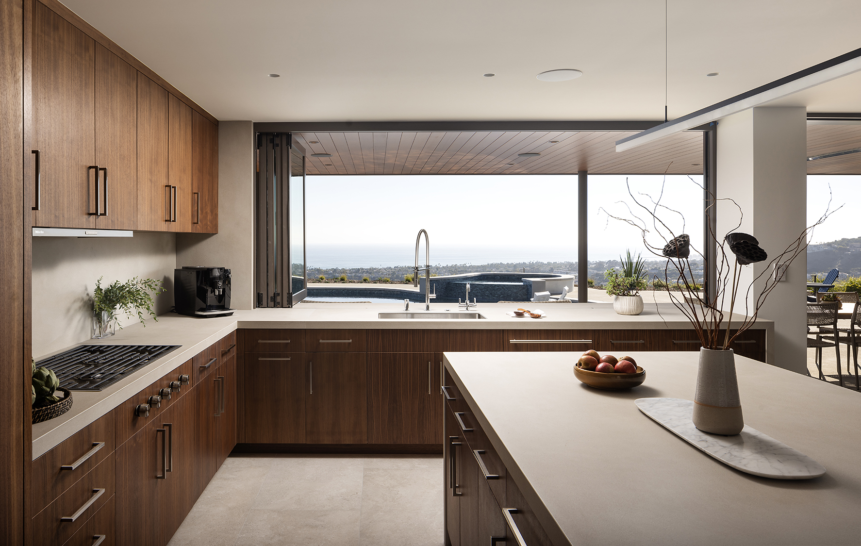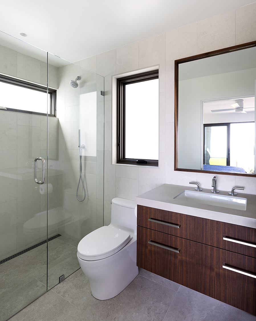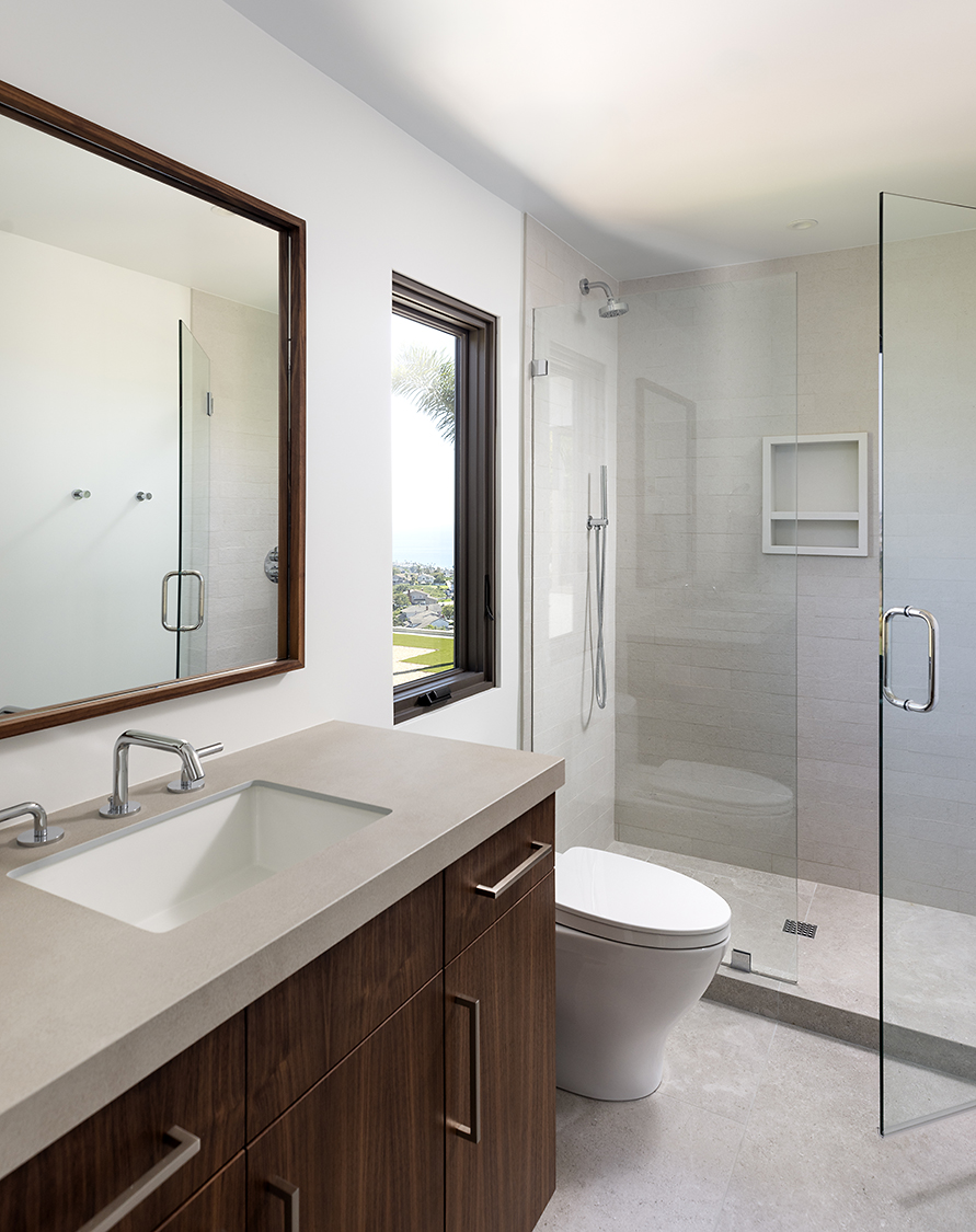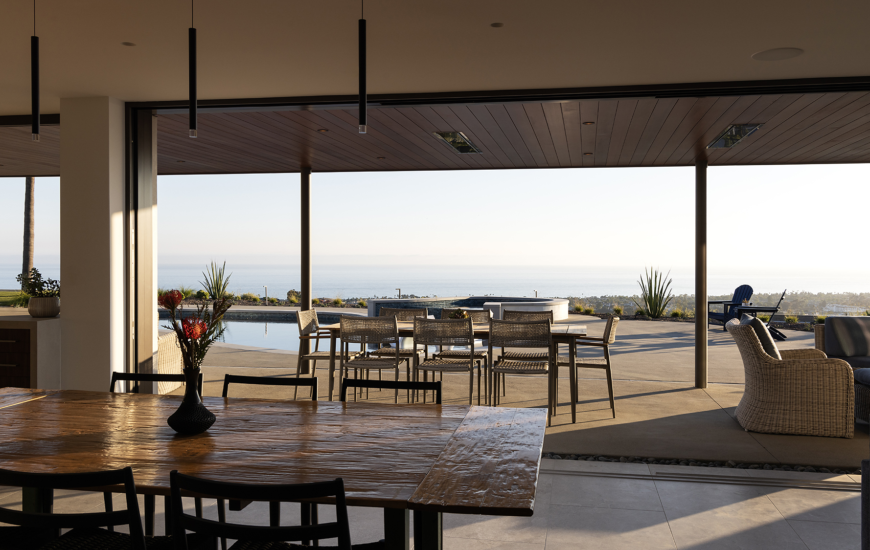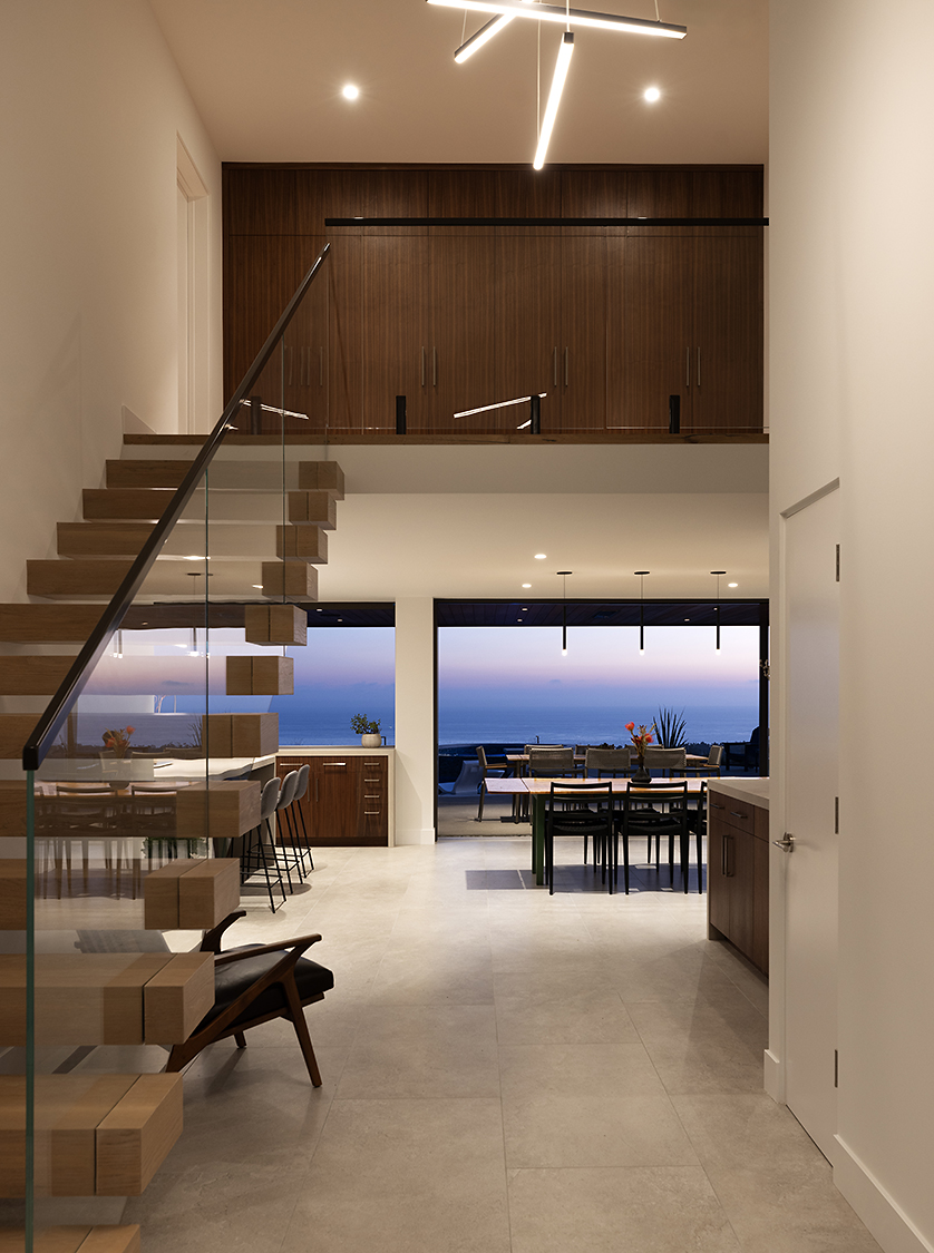 The design prioritizes orientation and view, with layered terraces and strategically placed openings that frame the Pacific horizon while maintaining privacy from neighboring properties. Interior spaces are organized to promote visual continuity, allowing natural light to move freely through the plan. Natural interior finishes were selected throughout the home to promote wellbeing and calmness.