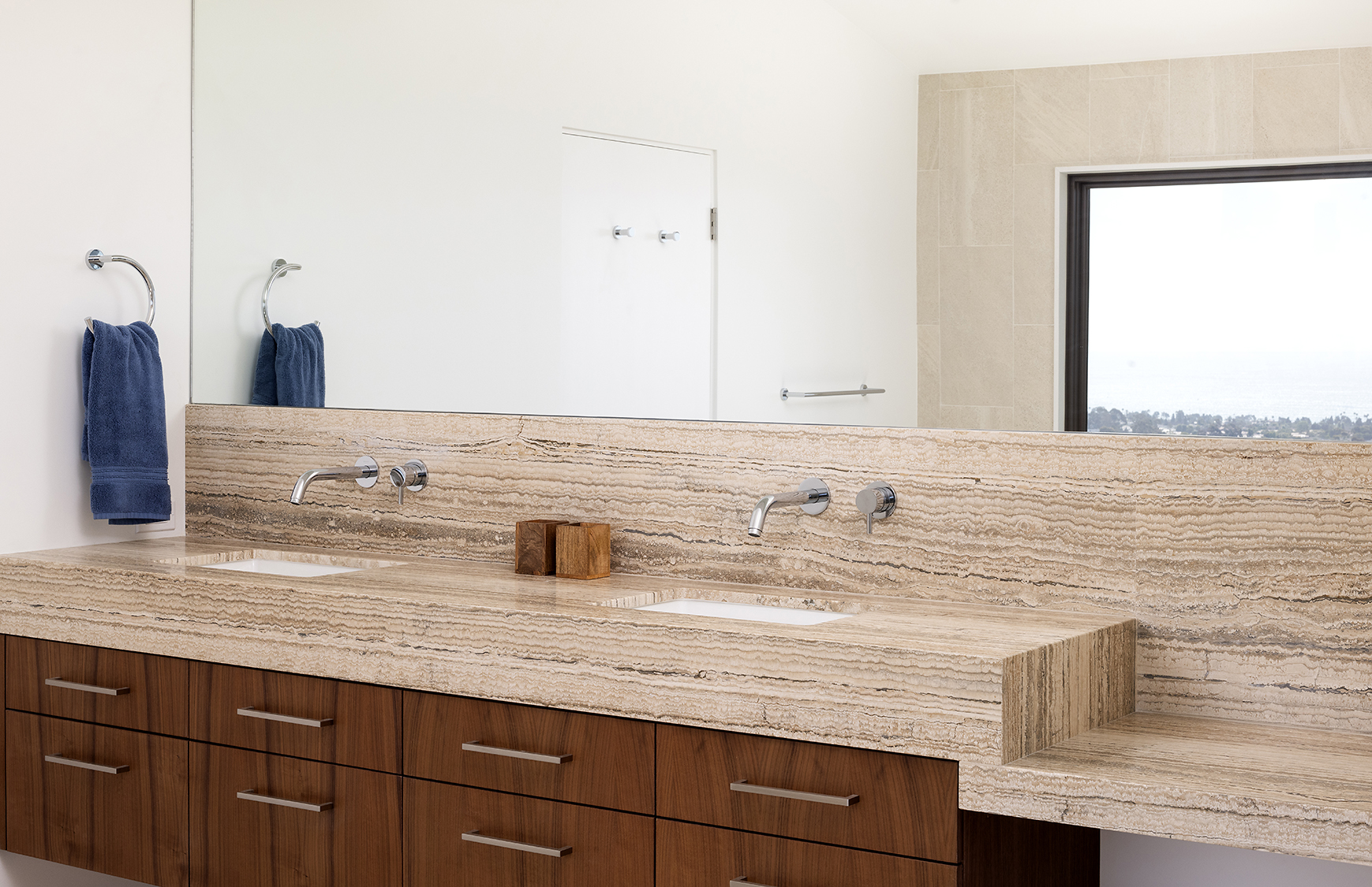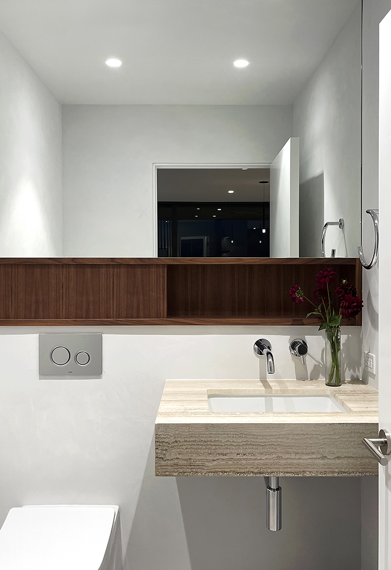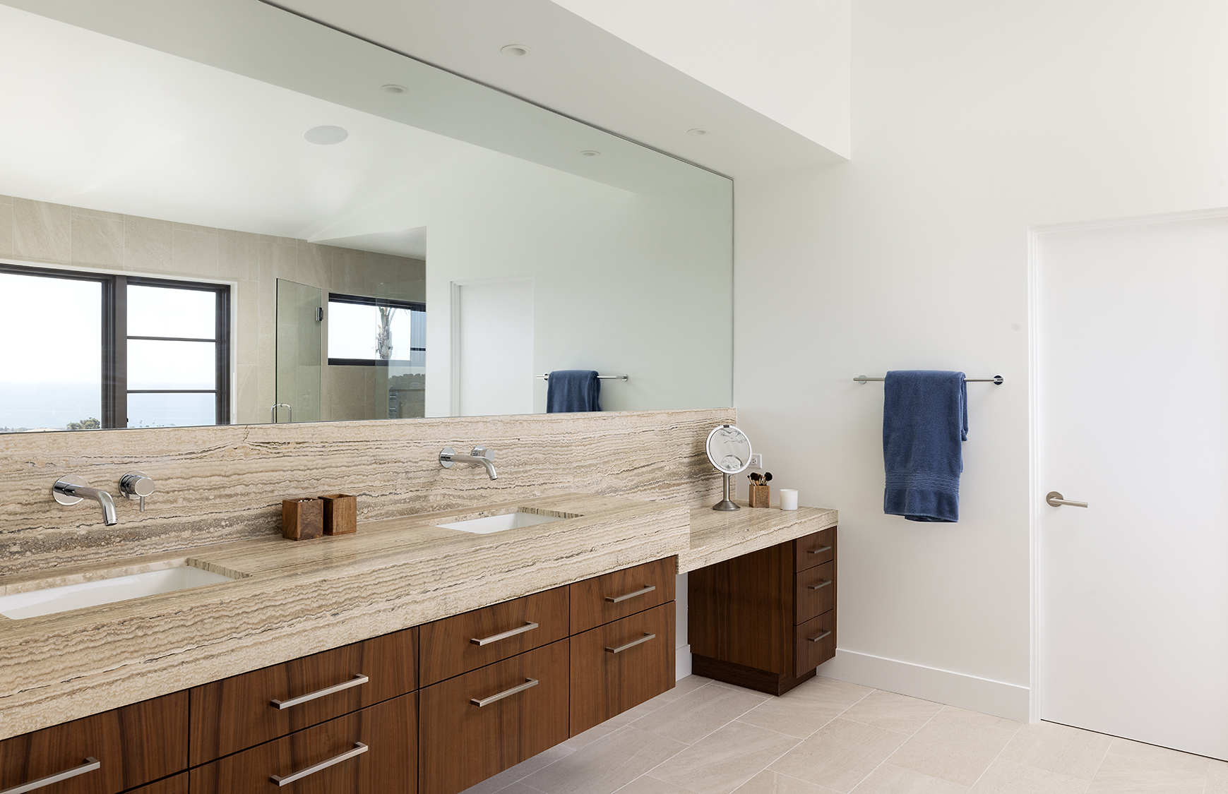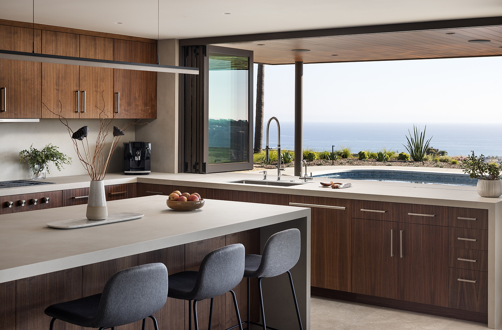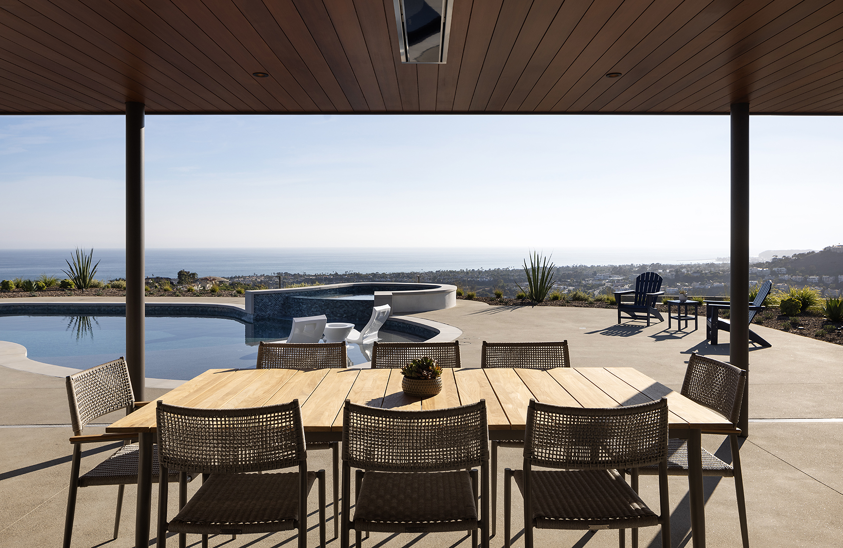 The design prioritizes orientation and view, with layered terraces and strategically placed openings that frame the Pacific horizon while maintaining privacy from neighboring properties. Interior spaces are organized to promote visual continuity, allowing natural light to move freely through the plan. Natural interior finishes were selected throughout the home to promote wellbeing and calmness.