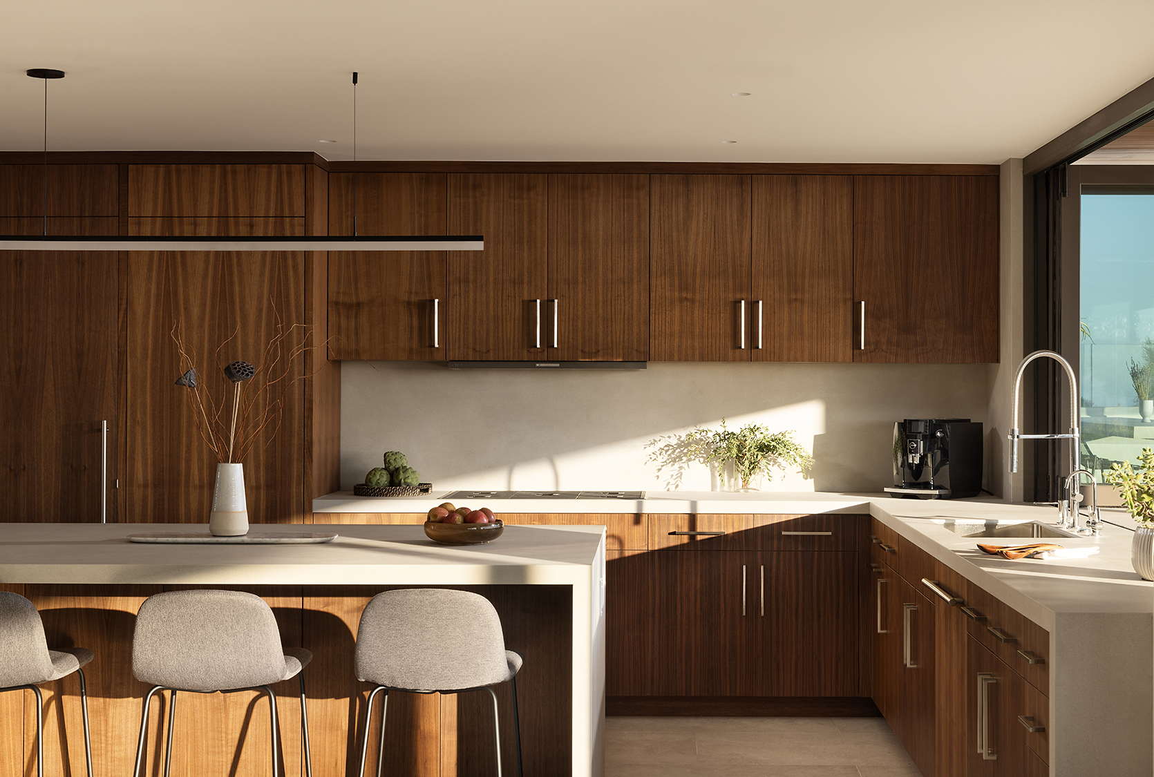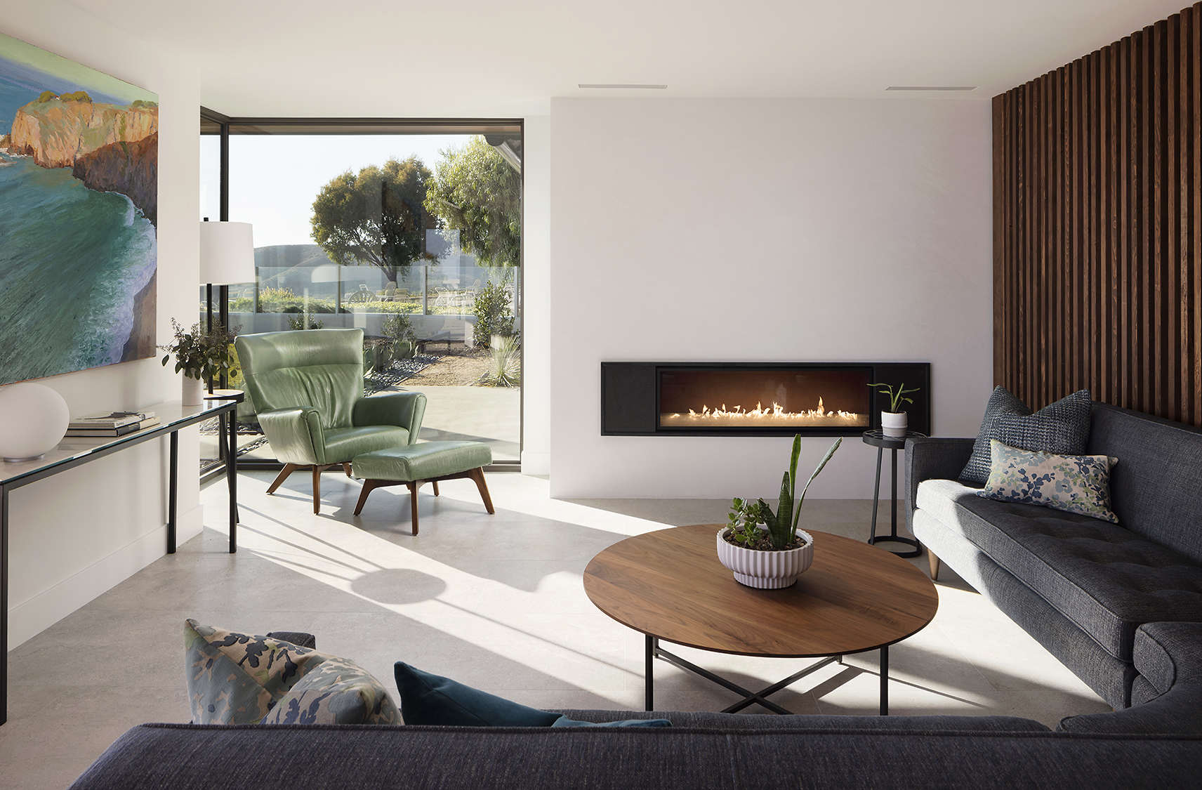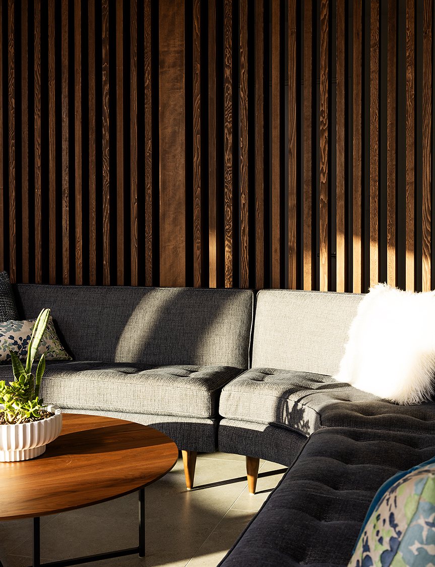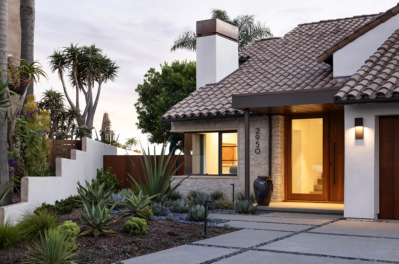 Material selections are cohesive and intentional, favoring texture and shadow over ornament. The result is a composed architectural statement — contemporary in execution, tailored to Coastal Southern California.
