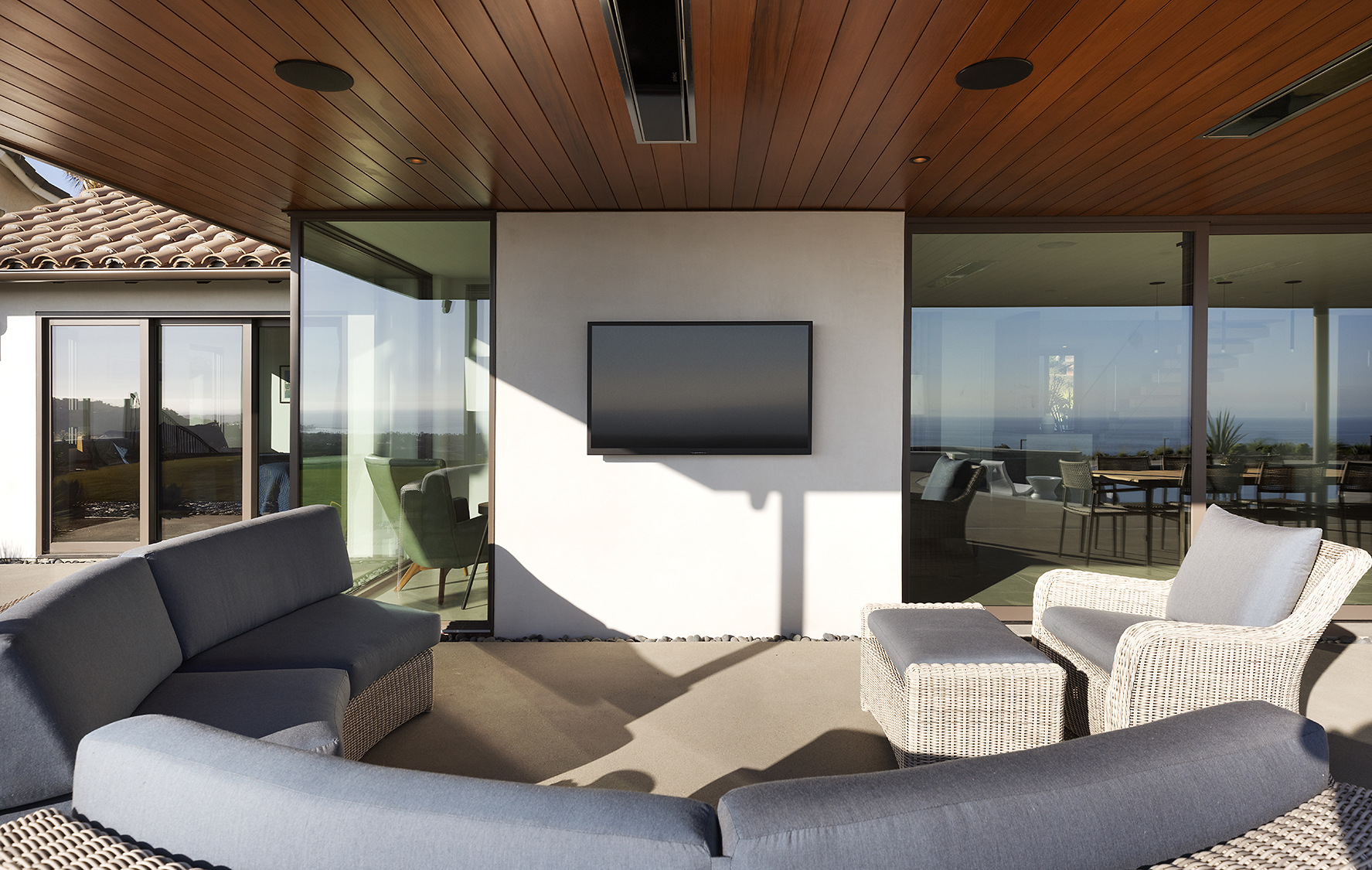 Outdoor living areas function as extensions of the interior program. Terraces and decks are integrated into the structure rather than appended, supporting year-round coastal use. Landscape design remains minimal and structured, complementing the architectural geometry through low-profile plantings and defined hardscape.