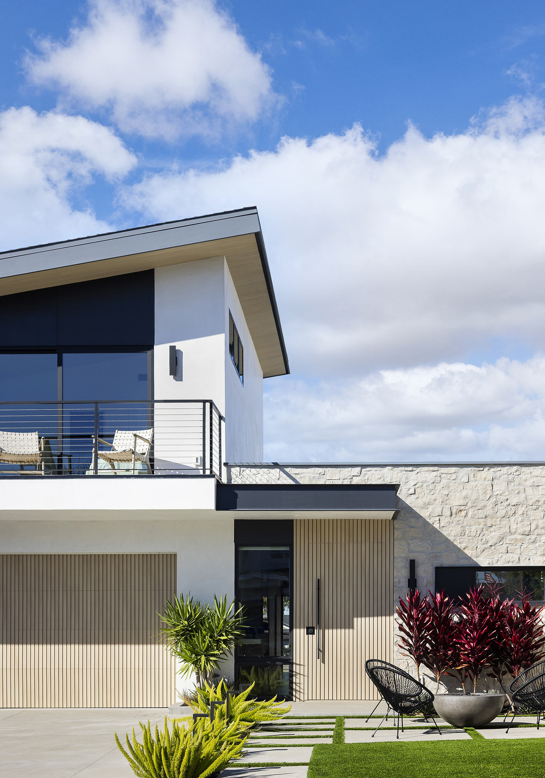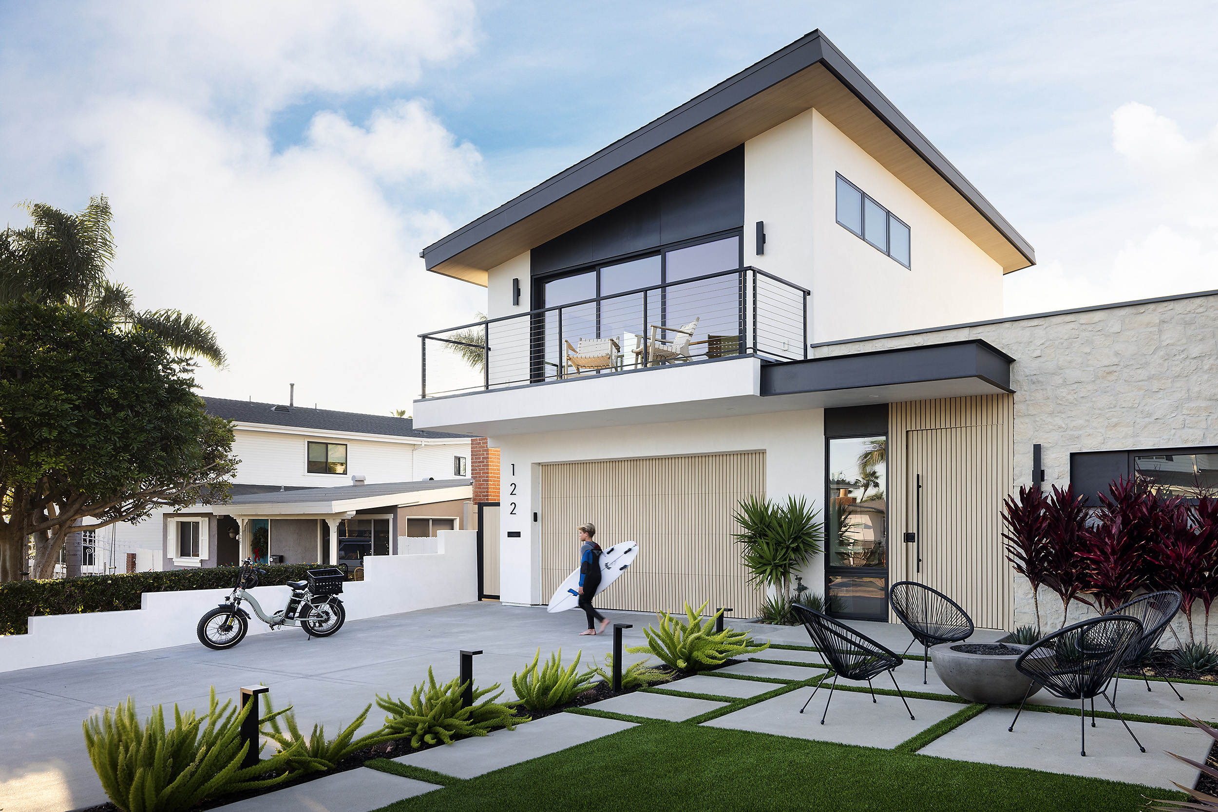 Landscape design reinforces the architecture’s minimal geometry. Stepping concrete pavers, structured planting beds, and low-profile coastal plantings establish a calm, organized entry sequence that complements the home’s contemporary character. The courtyard-like front yard introduces a welcoming outdoor gathering space while maintaining privacy from the street.
