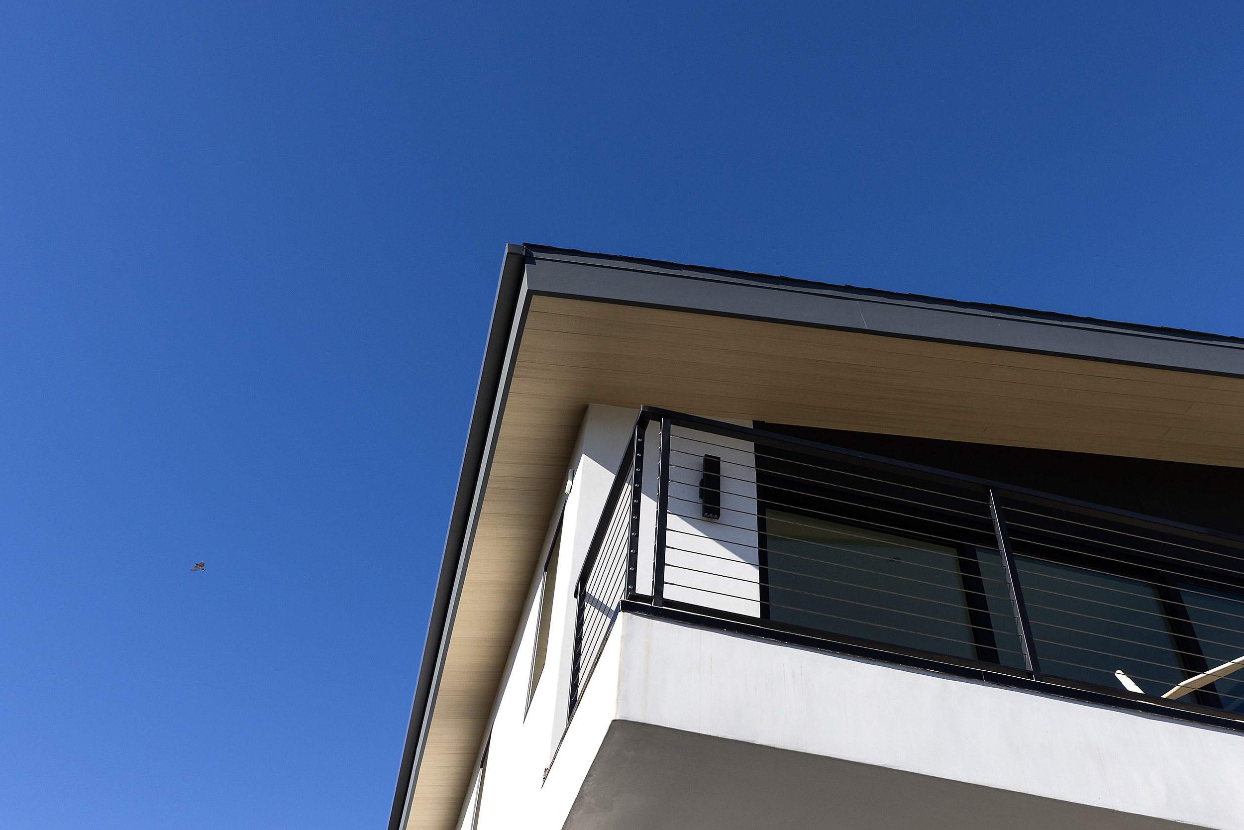 The home is composed of layered volumes that balance solid planes with expansive glazing. White stucco walls are contrasted by dark metal trim, warm wood elements, and natural stone accents, creating a modern palette that feels both refined and relaxed. A cantilevered upper level and ocean-facing balcony extend the living program outward while capturing coastal light and breezes.