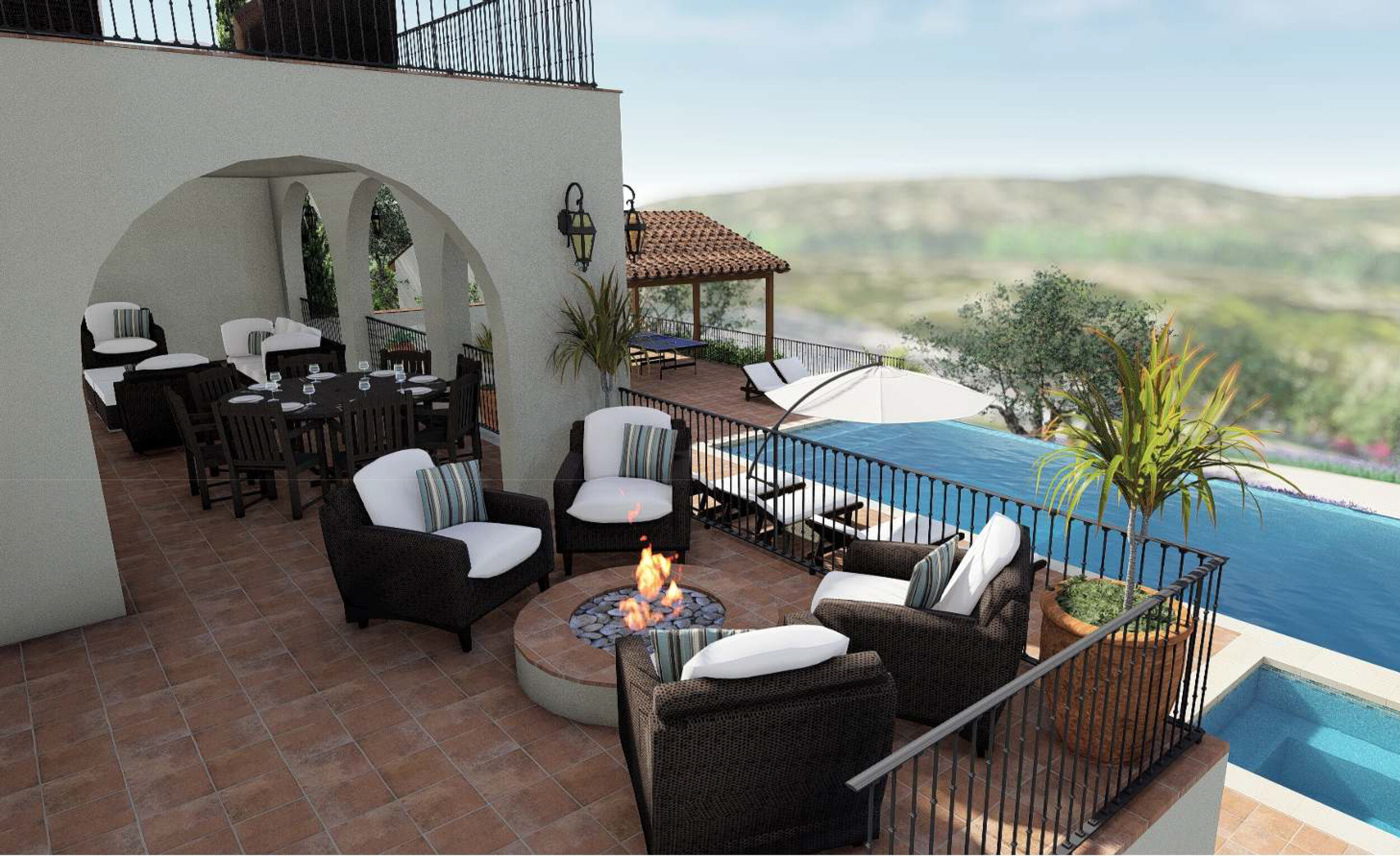 Covered loggias and pergola structures provide shaded gathering spaces, reinforcing the indoor–outdoor lifestyle characteristic of Southern California. Terracotta paving, wrought iron railings, and large clay planters introduce texture and warmth while maintaining a restrained material palette.