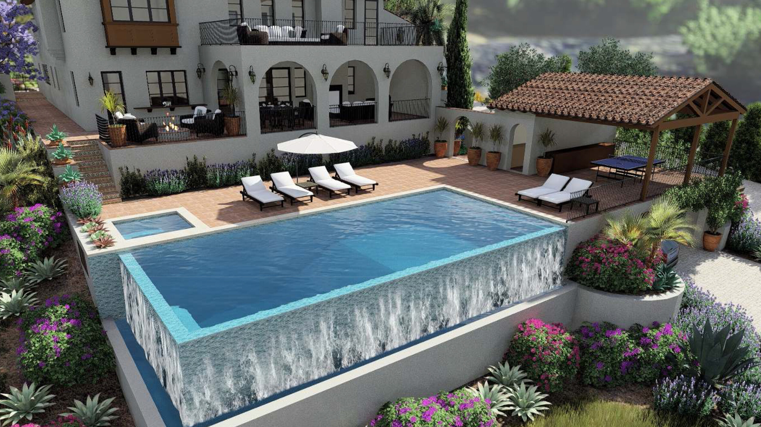 The home is organized around a central courtyard and a sequence of elevated terraces that respond to the site’s natural topography. These outdoor rooms extend the living program while framing long views across the surrounding hillsides. A dramatic infinity-edge pool forms the visual anchor of the landscape design, creating a seamless connection between water, horizon, and sky.
